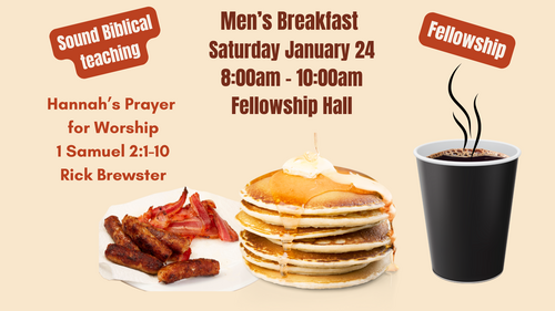 Men your next Men's Breakfast will be Saturday January 24th from 8:00-10:00am in the Fellowship Hall. The teaching is from 1 Samuel 2:1-10 Hannah's Prayer for Worship. Rick Brewster will be teaching. Come have a fulfilling time of fellowship, breakfast, and a sound Biblical teaching.
