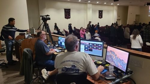 This ministry uses video equipment to track and record the Sunday morning teaching for live feed to various locations throughout the Church Main building (such as the Nursery and Fellowship Hall), as well as livestreaming to our website, Facebook, and YouTube. This ministry can also videotape weddings and other special events as required.